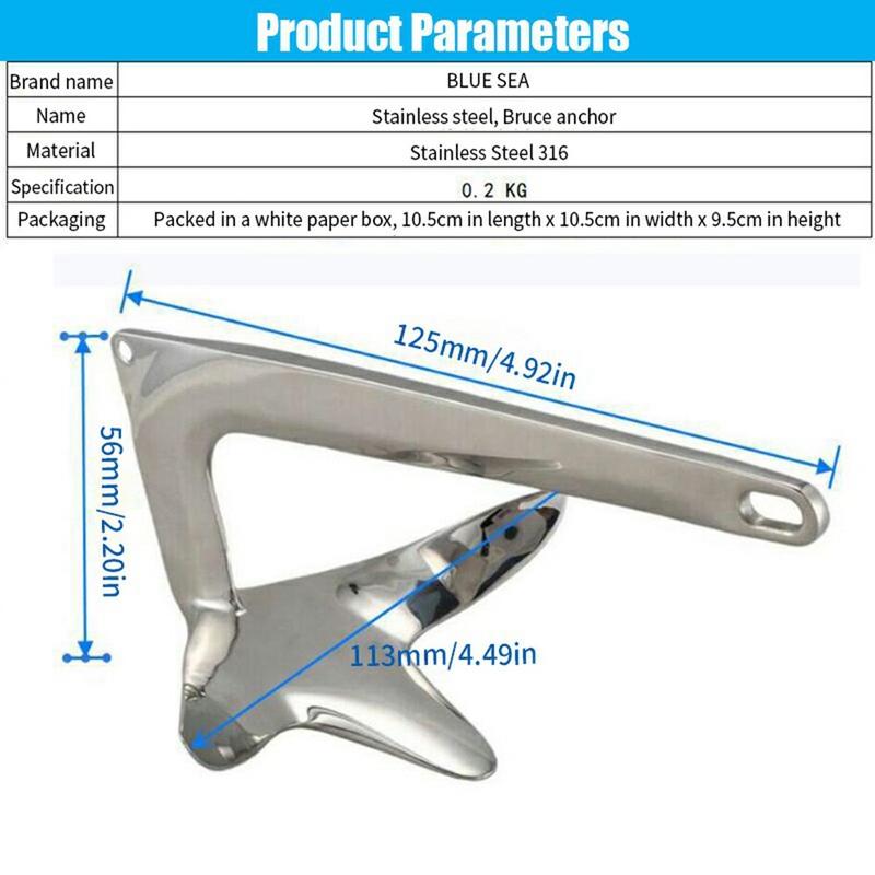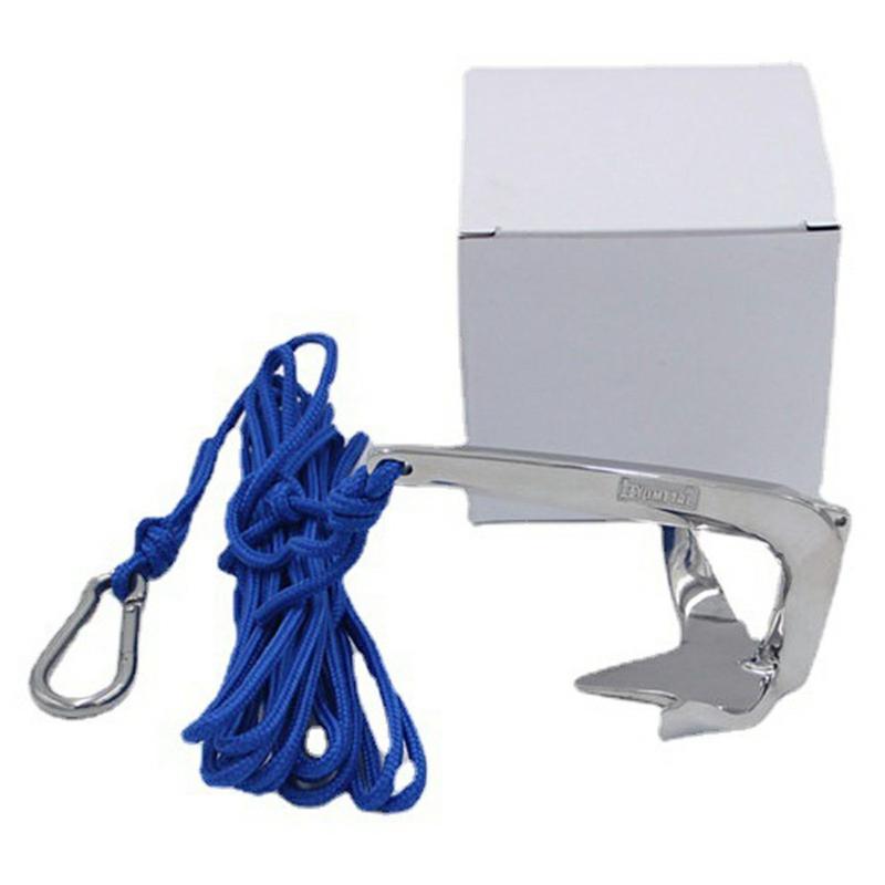 Bruce-ankare i 316 rostfritt stål 0,2 kg med 5m rep - kompakt ankare för kajak, uppblåsbar båt och små vattenskotrar (fjäderkrok ingår)