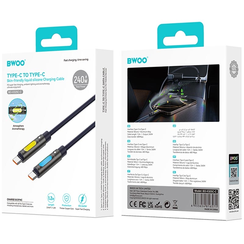 BWOO USB-C till USB-C aromaterapiladdningskabel 240 W 1,2 m - RGB-belysning, flytande silikon, 480 Mbps