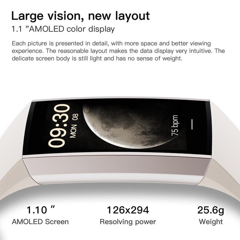AMOLED-skärm med hög upplösning: Har en 1.1-tums AMOLED-skärm med en upplösning på 126*294, som ger klara och levande bilder