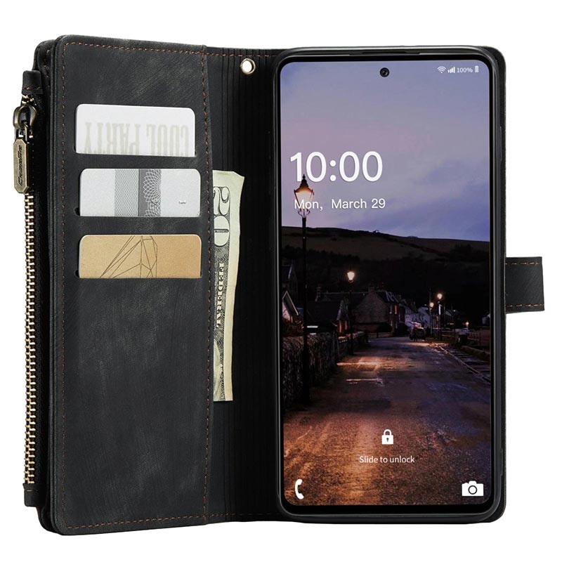 Detta multifunktionella plånboksfodral till Samsung Galaxy A33 5G kommer att lämna dig mållös. Det är designat med tio kortfickor, ett kontanttack och en dragkedjeficka – tillräckligt för att du ska kunna bära med dig alla dina viktigare saker. Det är tillverkat av kvalitativ polyuretan och inre TPU-material. Dina prylar hålls säkra med hjälp av den magnetiska stängningen. Fodralet kommer också med en handrem för säkrare bärning och det kan användas som stativ för en bättre handsfree-upplevelse när du tittar på videor.