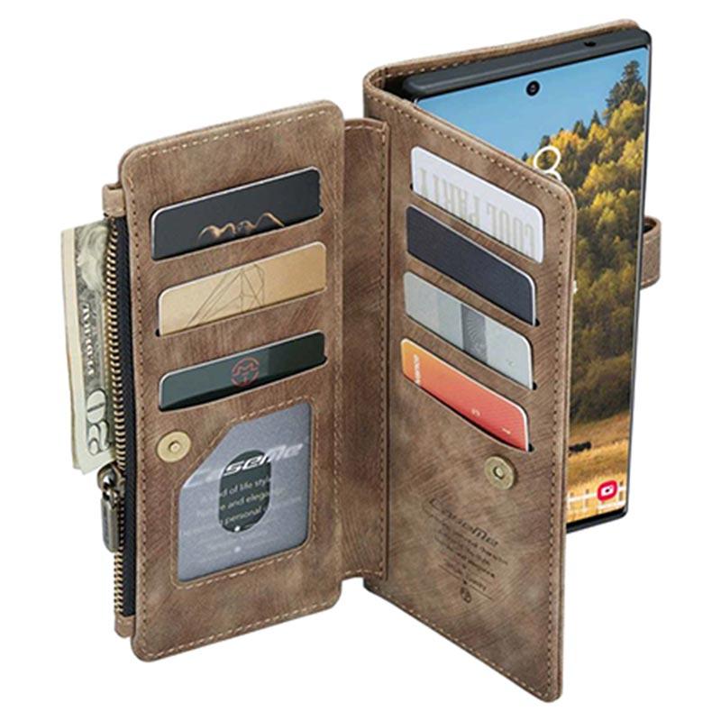 Detta multifunktionella plånboksfodral till Samsung Galaxy S22 Ultra 5G kommer att lämna dig mållös. Det är designat med tio kortfickor, ett kontanttack och en dragkedjeficka – tillräckligt för att du ska kunna bära med dig alla dina viktigare saker. Det är tillverkat av kvalitativ polyuretan och inre TPU-material. Dina prylar hålls säkra med hjälp av den magnetiska stängningen. Fodralet kommer också med en handrem för säkrare bärning och det kan användas som stativ för en bättre handsfree-upplevelse när du tittar på videor.