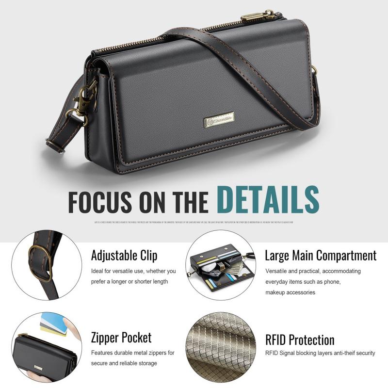Caseme Me30 är praktiskt utformad och har 7 kortfack, 1 sedelfack, 1 blixtlåsförsedd ficka och en dedikerad fotohållare som håller alla dina tillhörigheter organiserade och lättillgängliga. Dess kompatibilitet med smartphones från 4,0 till 7,5 tum garanterar en perfekt passform för de flesta telefoner, vilket gör den till den ultimata allt-i-ett-lösningen för dina dagliga behov.
