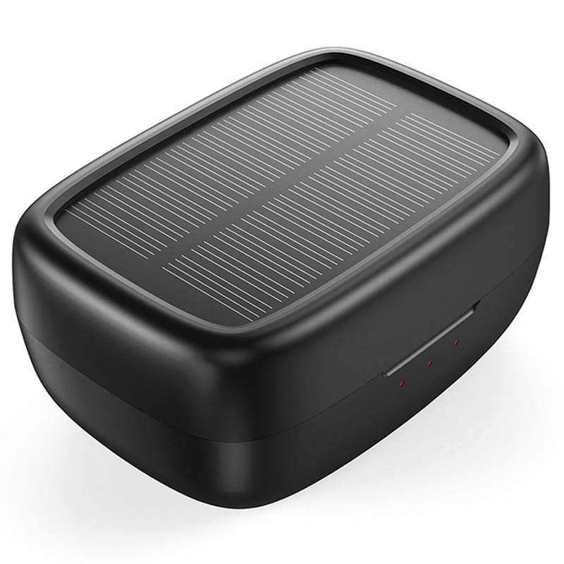 TWS hörlurar passar perfekt de som alltid är ute och på språng. Laddningsfodralet har en inbyggd solpanel så att du kan alltid ladda upp den med solenergi. Dessa utmärkta trådlösa hörlurar ger 6 till 8 timmar speltid, beroende på musikvolymen.