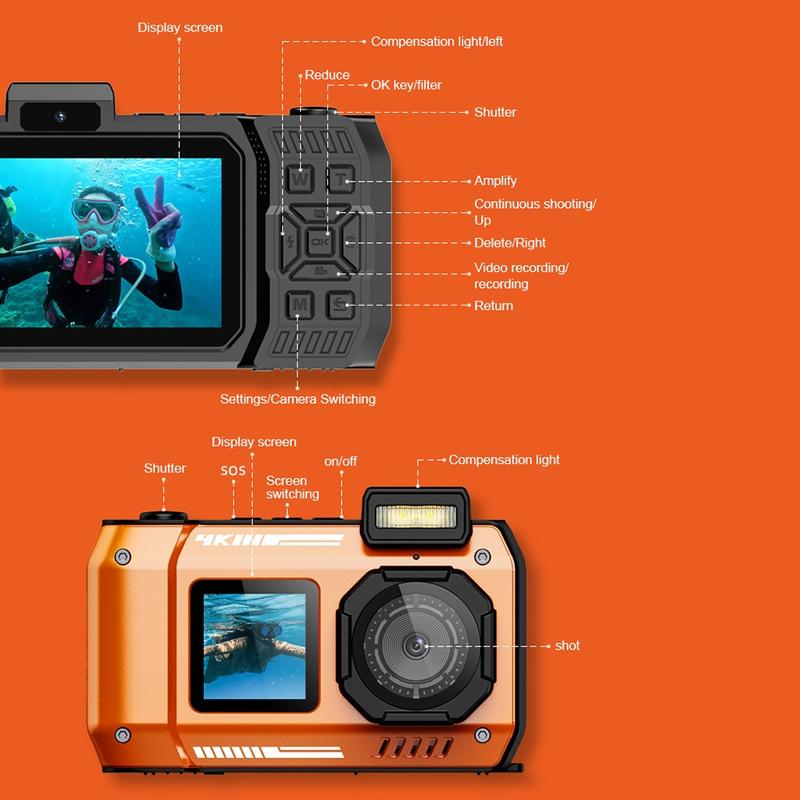 Den vattentäta actionkameran D50 är byggd för utomhusäventyr, resor och vattensporter och kombinerar en design med dubbla skärmar med enkel användning och lång drifttid. Använd den främre 1,44-tums IPS-skärmen för selfies och vlogging och den bakre 2,88-tums IPS HD-skärmen för bildkomposition, uppspelning och snabb granskning. Med IP68-vattentäthet upp till 10 m är den redo för dagar vid poolen, snorkling och regniga vandringar. Kreativa fotografer kommer att älska de 20 speciella filtereffekterna, medan den elektroniska bildstabiliseringen hjälper till att hålla filmen jämnare när du rör dig. En inbyggd SOS-funktion med ett klick ger extra trygghet för utomhusaktiviteter. Detta set innehåller också ett 32GB TF-kort och kortläsare, så att du kan börja filma direkt.