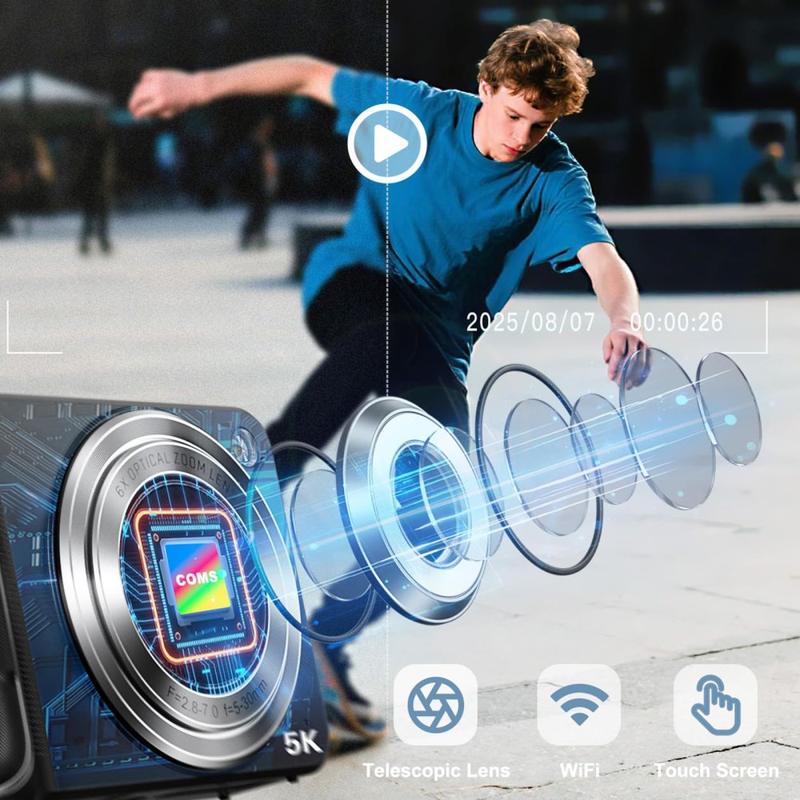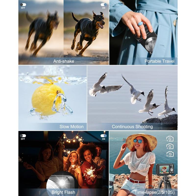 Minidigitalkameran DC309X kombinerar dubbla högupplösta objektiv, 6X optisk zoom och avancerad stabilisering för att leverera exceptionella foton och videor i en kompakt, bärbar design. Kameran är utrustad med en professionell GC8613 800W-frontsensor och en bakre Sony IMX214 13MP selfie-objektiv, vilket ger skarpa detaljer för landskap och perfekt klarhet för självporträtt. Dess 2,8-tums IPS HD-pekskärm ger tydlig visning och intuitiv kontroll.