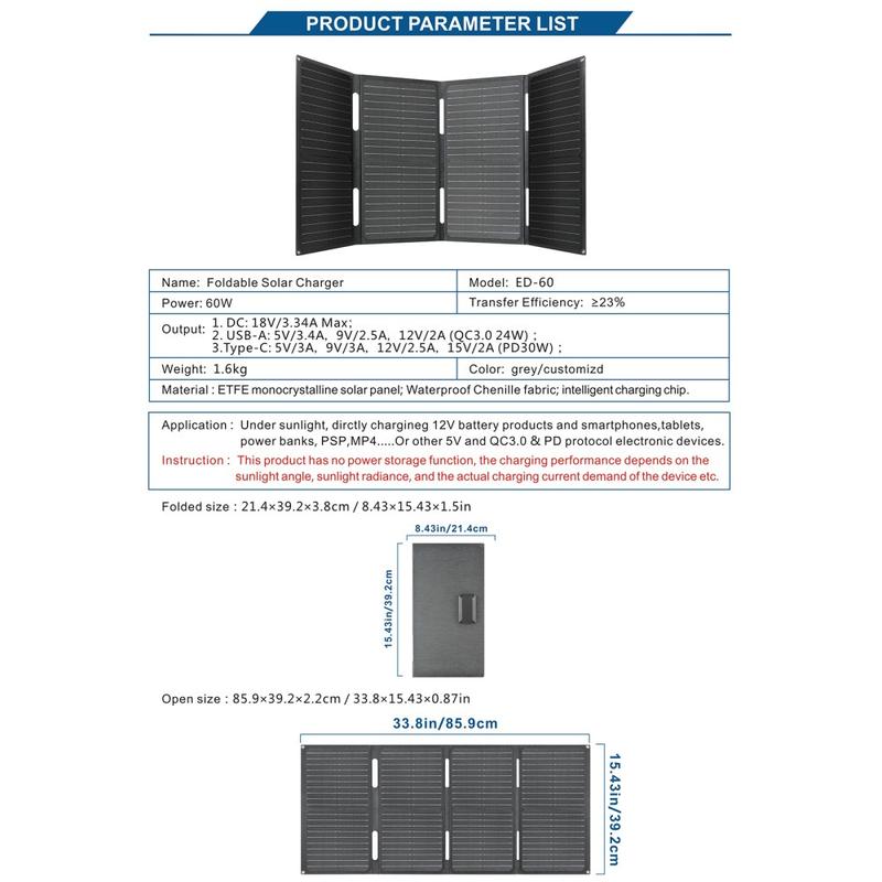 Den hopfällbara solcellsladdaren DE-60 på 60W är en bärbar strömförsörjningslösning för utomhusbruk, utformad för camping, vandring, resor, husbilsliv och som reservkraft i nödsituationer. Den är tillverkad med högeffektiva monokristallina solceller och slitstark ETFE-laminering, vilket gör att den omvandlar solljus till användbar energi på ett mer effektivt sätt och hjälper dig att hålla viktiga enheter laddade när du befinner dig utan tillgång till elnätet.