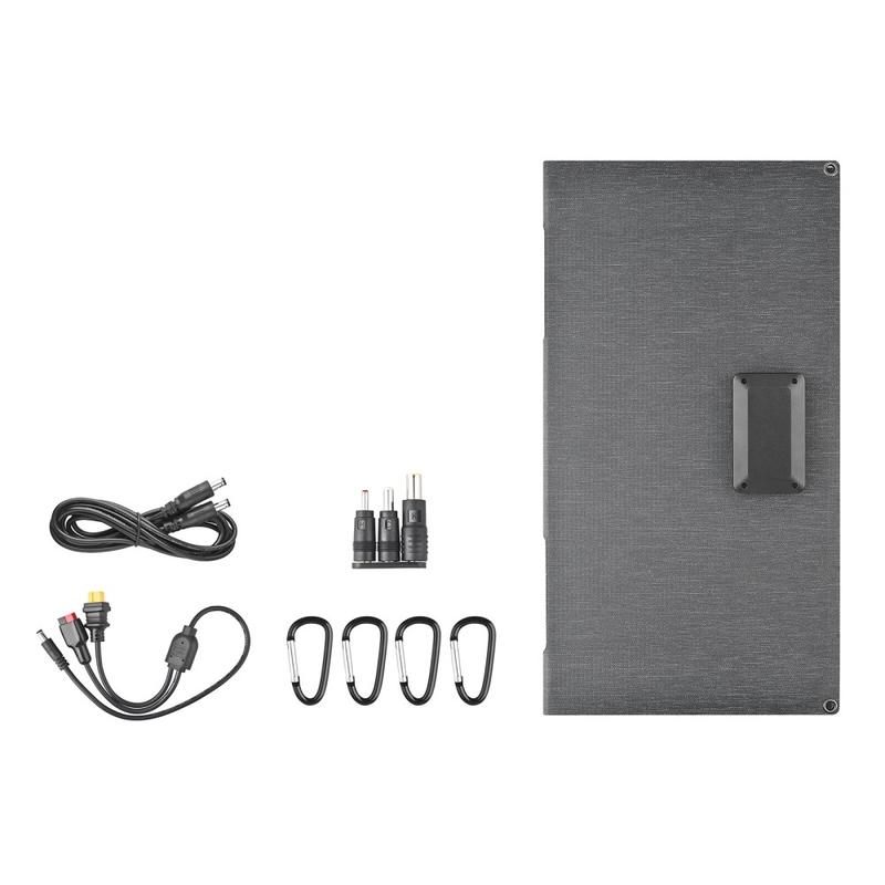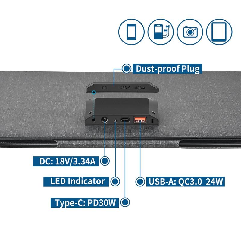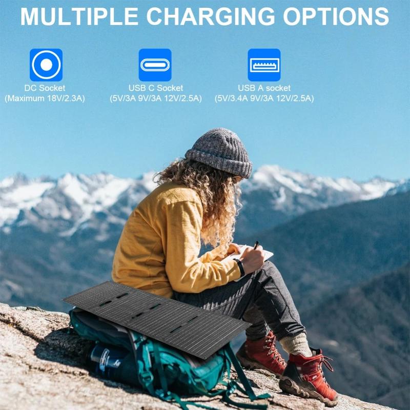 Med sin kompakta, hopfällbara design är denna solcellsladdare lätt att bära i en ryggsäck, förvara i ett fordon eller fästa på utomhusutrustning under resan. Trots sin bärbara storlek erbjuder den upp till 60W uteffekt och flera laddningsalternativ, inklusive DC, USB-A och USB-C, vilket gör den lämplig för laddning av telefoner, surfplattor, powerbanks, mindre bärbara datorer, kameror och andra kompatibla enheter.