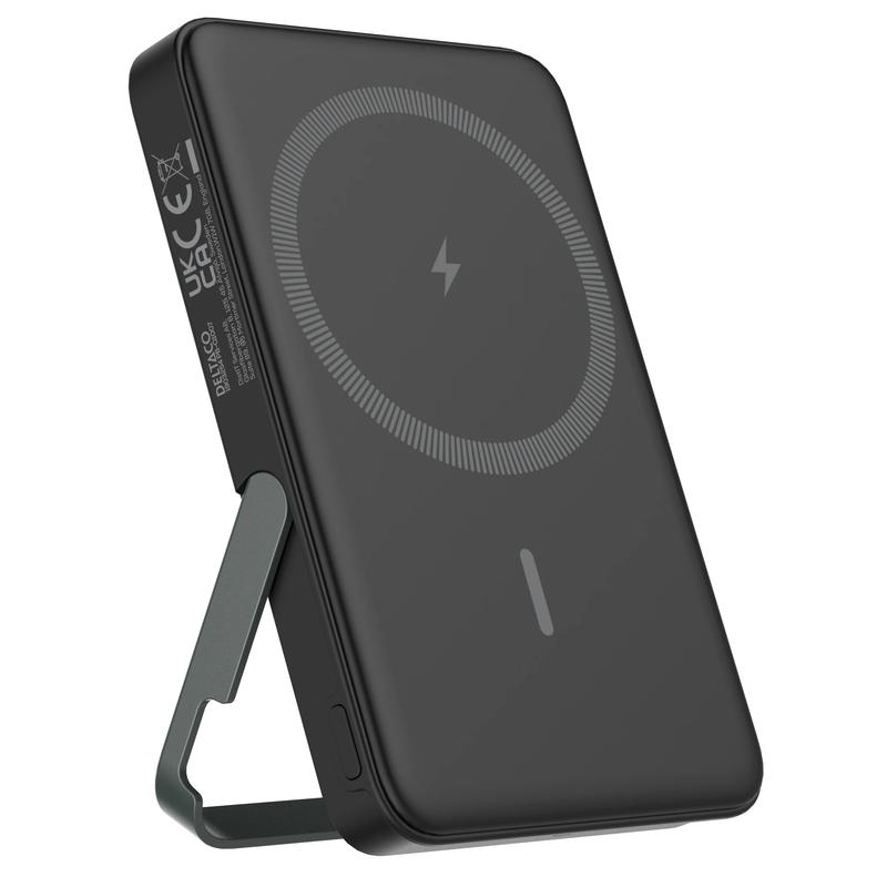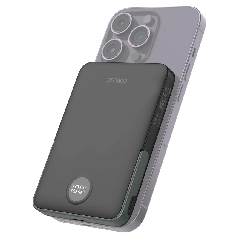 Ha extra ström nära till hands med Deltacos magnetiska trådlösa powerbank på 5000mAh. Denna kompakta, bärbara laddare är utformad för att underlätta vardagen och kombinerar trådlös laddning, snabbladdning via USB-C PD och ett inbyggt stativ i en praktisk enhet. Den är ett utmärkt val för pendling, resor, arbetsdagar och som extra laddningskälla i vardagen när du behöver en enkel och smidig strömförsörjning.