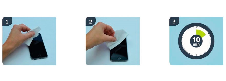 1. Använd den våta servetten nr. 1 (alkoholservett) för att ta bort damm och smuts från glasskärmen (och vid behov även den bakre kameralinsen).