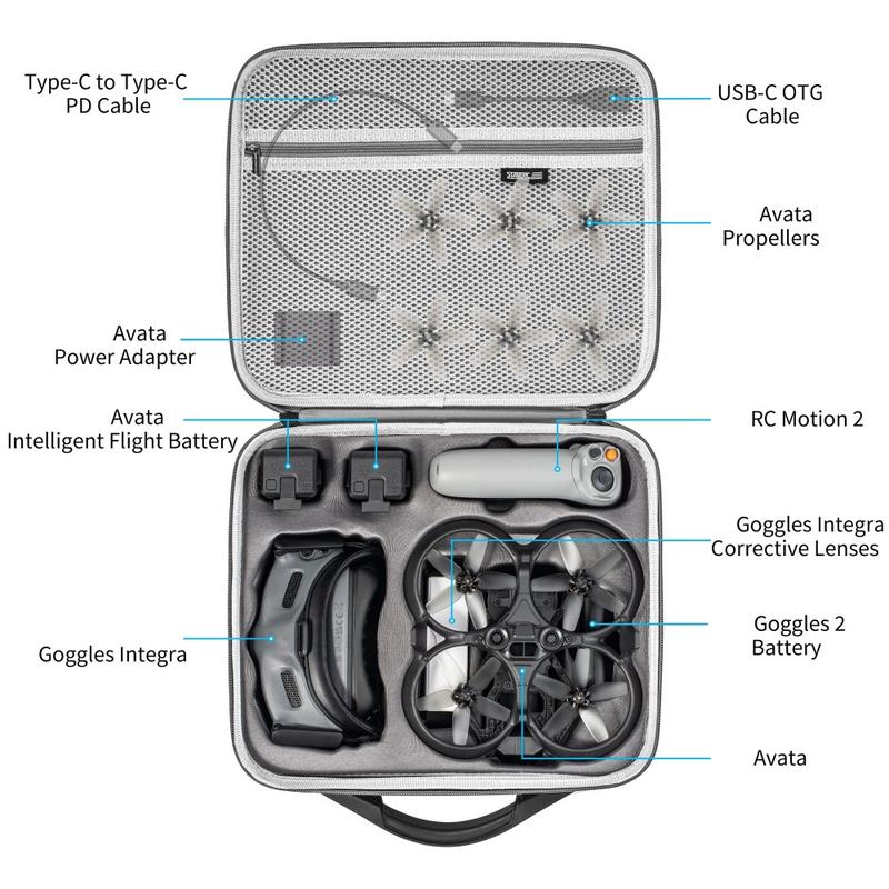 - Anpassad design: Väskan är skräddarsydd för DJI Avata och har exakta fack för säker förvaring av drönare, fjärrkontroll, batterier, laddningsadapter, laddare, skyddsglasögon och andra små tillbehör.