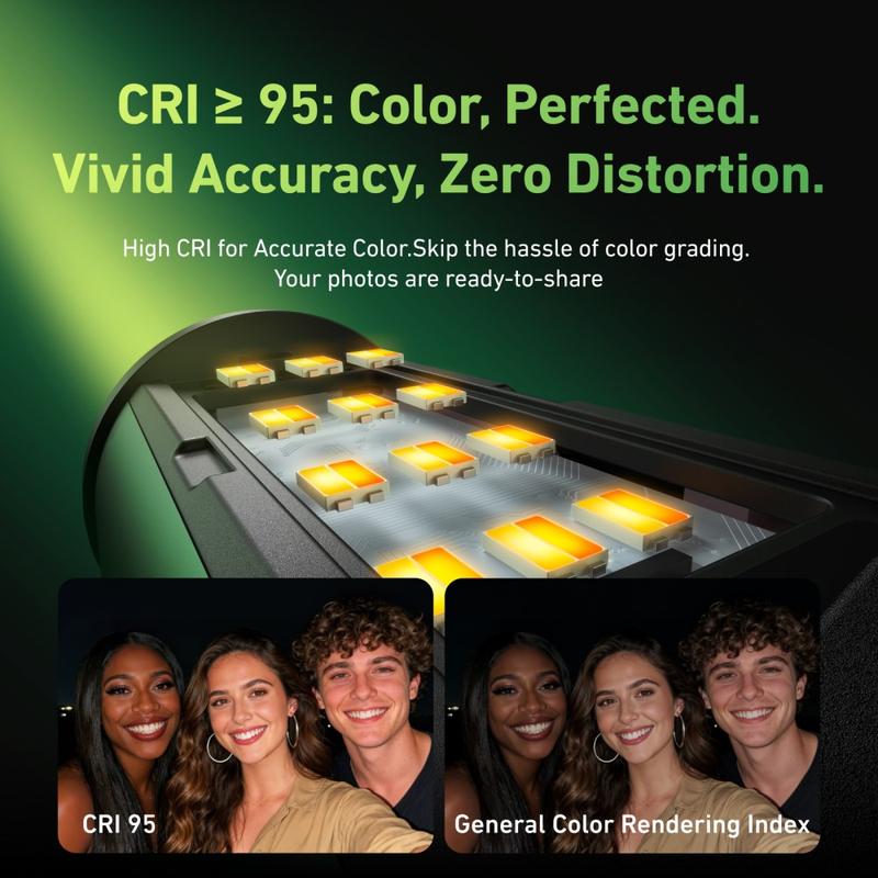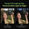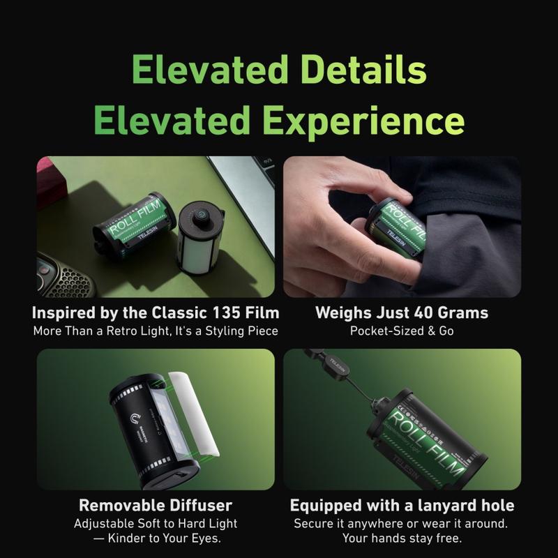 Dess retroinspirerade filmrulledesign ger ett distinkt utseende, medan den dubbla färgtemperaturen hjälper dig att anpassa ljuset till olika fotograferingsförhållanden. Använd den som ett mjukare fyllnadsljus på dagen för att minska skuggor eller som en starkare ljuskälla på natten för tydligare bilder i mörkare miljöer. Med ett färgtemperaturintervall på 2700K-7500K och CRI 95 eller högre ger lampan mer naturliga färger och minskar behovet av senare färgkorrigering.