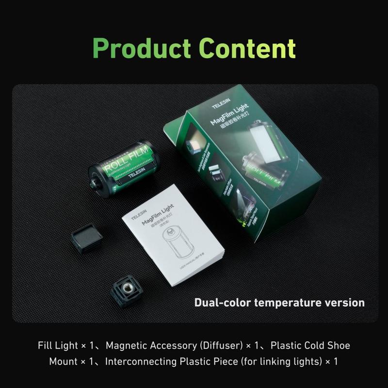 Den avtagbara magnetiska diffusorn gör det enkelt att växla mellan mjukare och mer direkt belysning, vilket ger dig större flexibilitet i olika scener. Tack vare det medföljande kallskofästet och standardkompatibiliteten med 1/4" fungerar TELESIN MagFilm Fill Light bra med actionkameror, spegellösa kameror, smartphones och bärbara filmrigg.