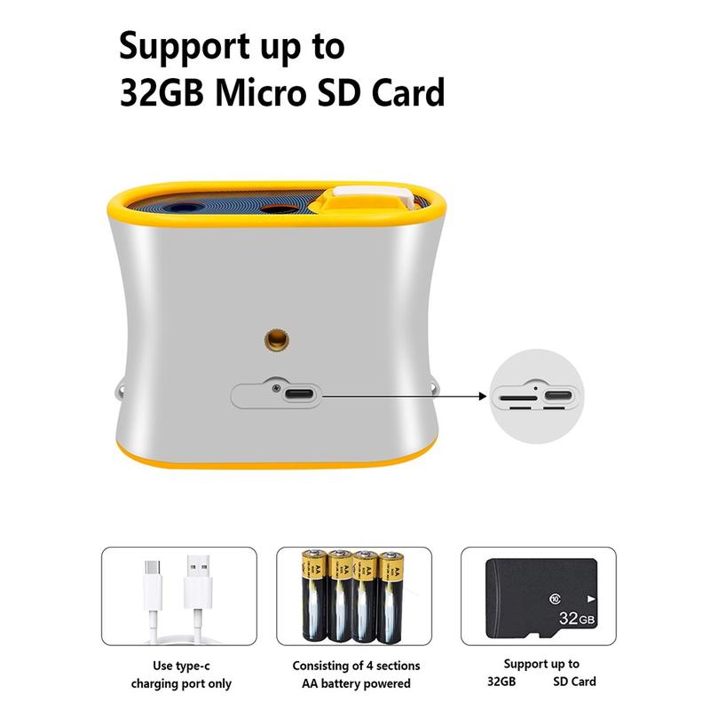 DT15 drivs av 4 × AA-batterier eller Typ-C-laddning, vilket gör den bekväm att använda på resor och utomhus. Med sin lätta design och det medföljande nyckelbandet kan barnen bära den säkert och bekvämt. Lagringsutrymmet kan utökas med ett 32 GB microSD-kort (medföljer ej).