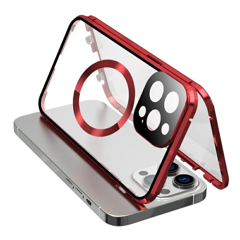 Dubbelsidigt skal med härdat glas + magnetisk metallram för iPhone 15 Kompatibelt med MagSafe telefonskydd med spänne - Röd