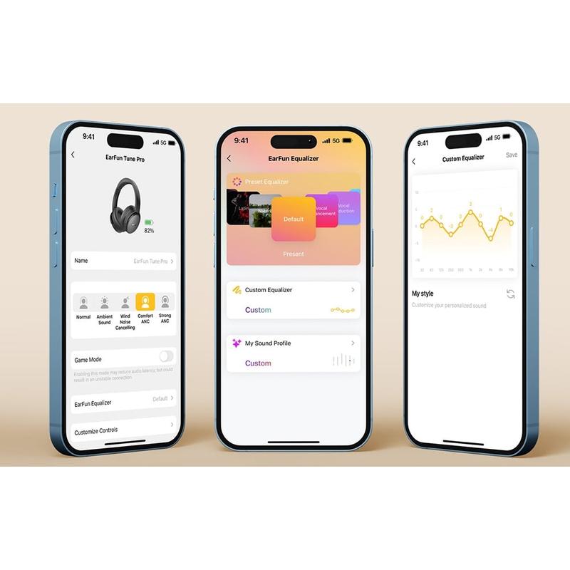 Earfun Audio App gör att du kan anpassa hörlurarnas inställningar. Du kan välja mellan 30 Equalizer-lägen, ändra ANC-lägen, kontrollera laddningsnivåer och uppdatera programvaran.