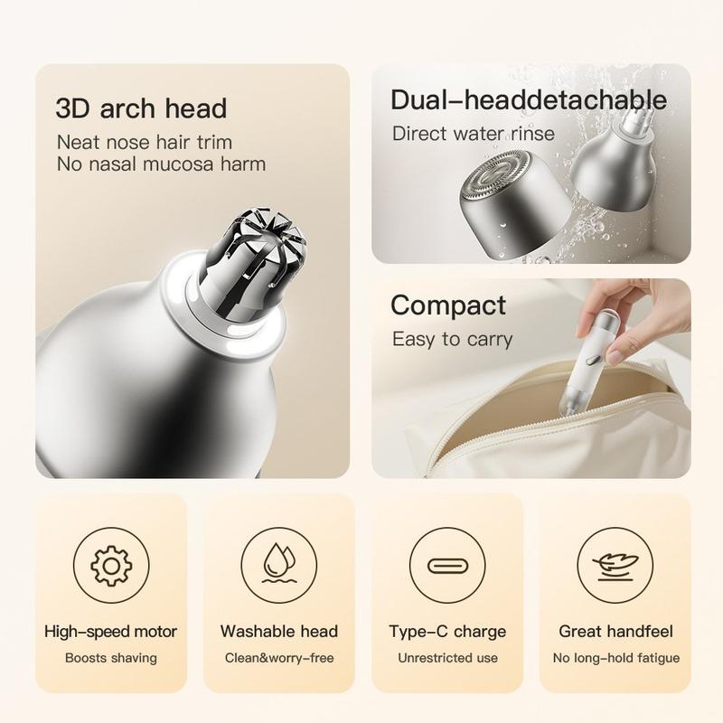 Gör din dagliga skötsel enkel och precis med denna elektriska näshårstrimmer och hårtrimmer för män. Detta bärbara skötselverktyg har en kompakt design som ryms i handflatan och kombinerar funktioner för trimning av näshår och ansiktshår i en och samma enhet, vilket gör den till ett praktiskt val för hemmet, jobbet, gymväskan och resan. Den lilla storleken gör den enkel att förvara och ta med sig, medan den sladdlösa, uppladdningsbara designen ger extra bekvämlighet i vardagen.