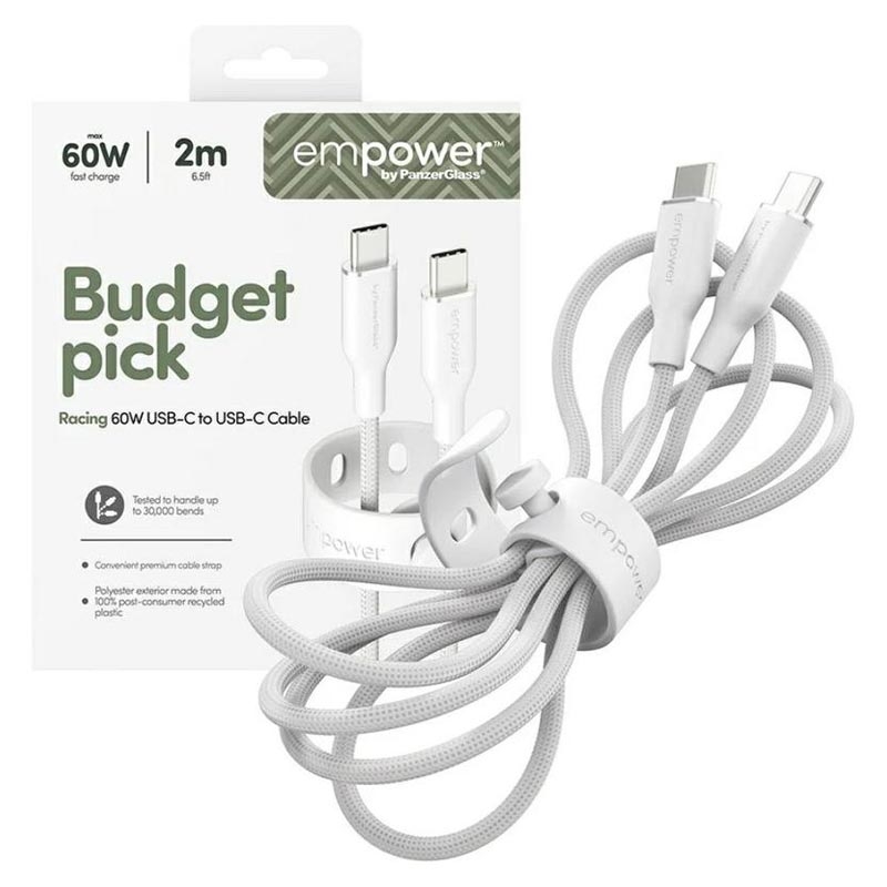 Empower by PanzerGlass Racing USB-C till USB-C-kabeln är byggd för hastighet och hållbarhet och stöder snabb 60W-laddning för ett brett utbud av USB-C-enheter. Den ultramjuka, trasselfria designen gör den enkel att använda varje dag, medan återvunna material ger denna premiumkabel en hållbar touch.
