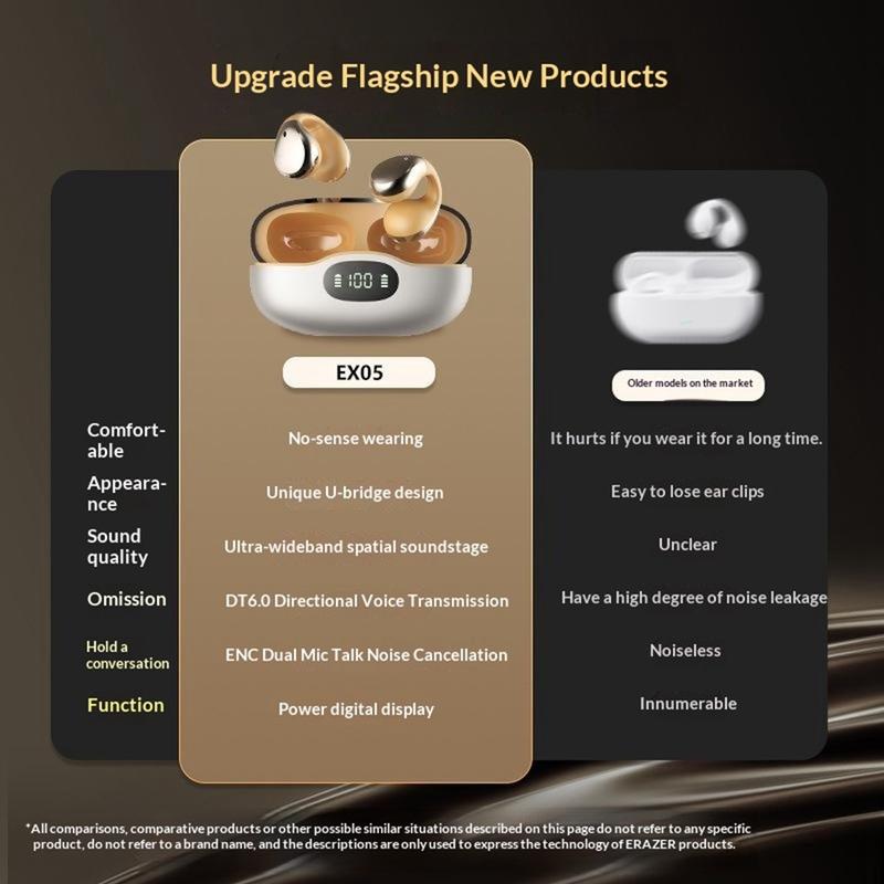ERAZER EX05 är ett utmärkt val för användare som vill ha ett bekvämare alternativ till traditionella in-ear-hörlurar. Den öppna clip-on-designen gör dem lätta att bära under längre perioder, medan laddningsfodralet och batteridisplayen ger extra bekvämlighet i vardagen.