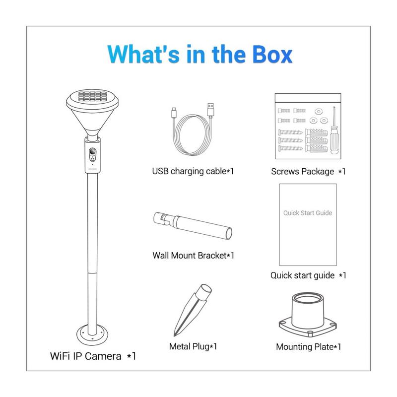 - Strömförsörjning: Solcell 2W, 5,5V / 400mA max; Batteri: 2600mAh kamera + 2000mAh lampa