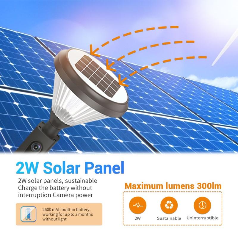 - Solenergi + dubbla batterier - En 2W-panel laddar upp lampans 2000mAh-cell och kamerans 2600mAh-cell; bara 3-6 timmars solljus håller enheten igång i flera veckor.