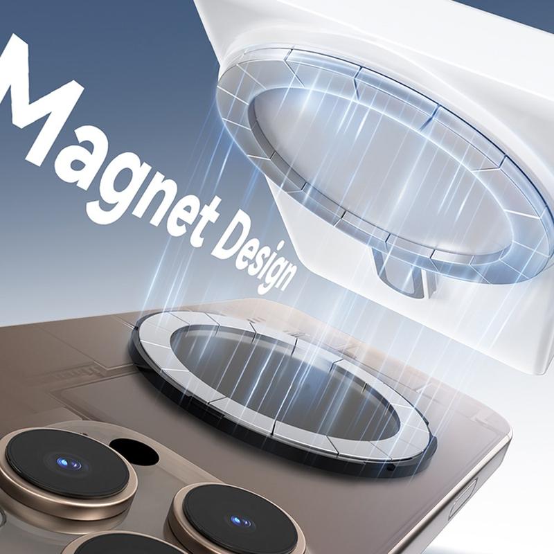 Det inbyggda magnetfästet gör att du snabbt och säkert kan fästa kameran på din telefon med hjälp av den medföljande metallskivan. Perfekt för handhållen fotografering, stativ, gimbals eller inspelning på bord.