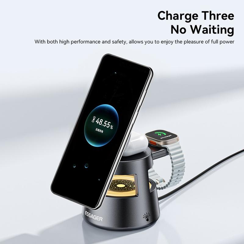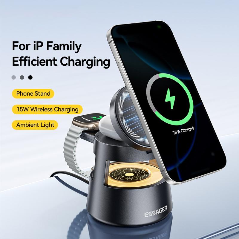 Denna 4-i-1-laddare från ESSAGER kombinerar snabbladdning, magnetisk stabilitet, mjuk belysning och stöd för flera enheter i en enda, utrymmesbesparande design - perfekt för användning hemma, på kontoret eller vid sängen.