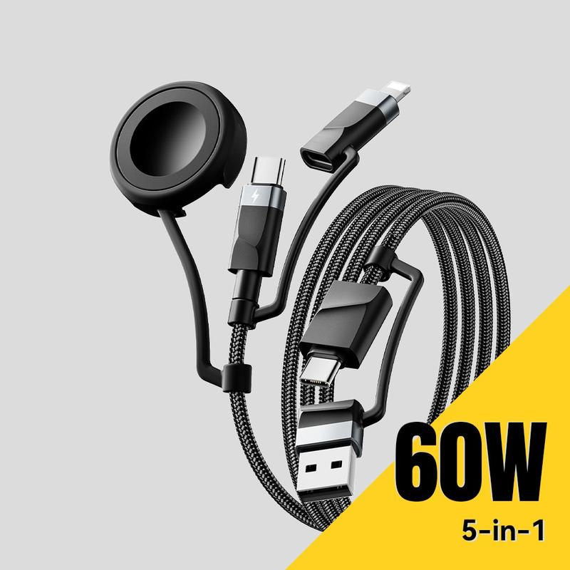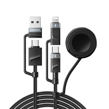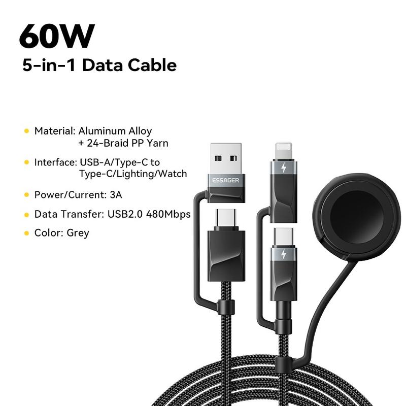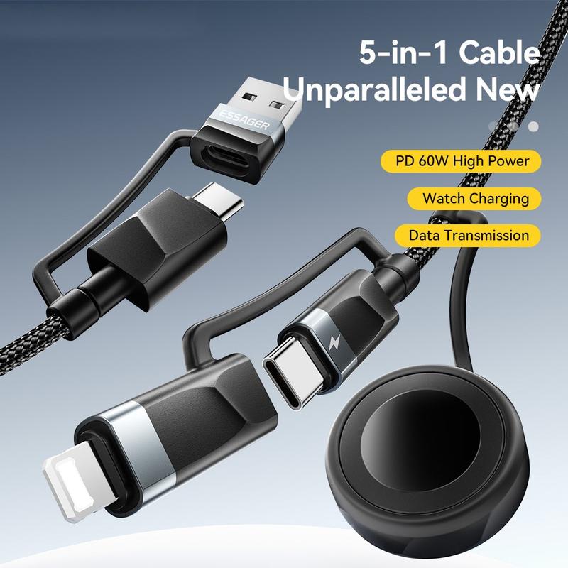 Essager 5-i-1 snabbladdningskabel 1m - PD 60 W multikabel med USB-C, Lightning, USB-A och Apple Watch-kontakt, 480 Mbps datasynkronisering