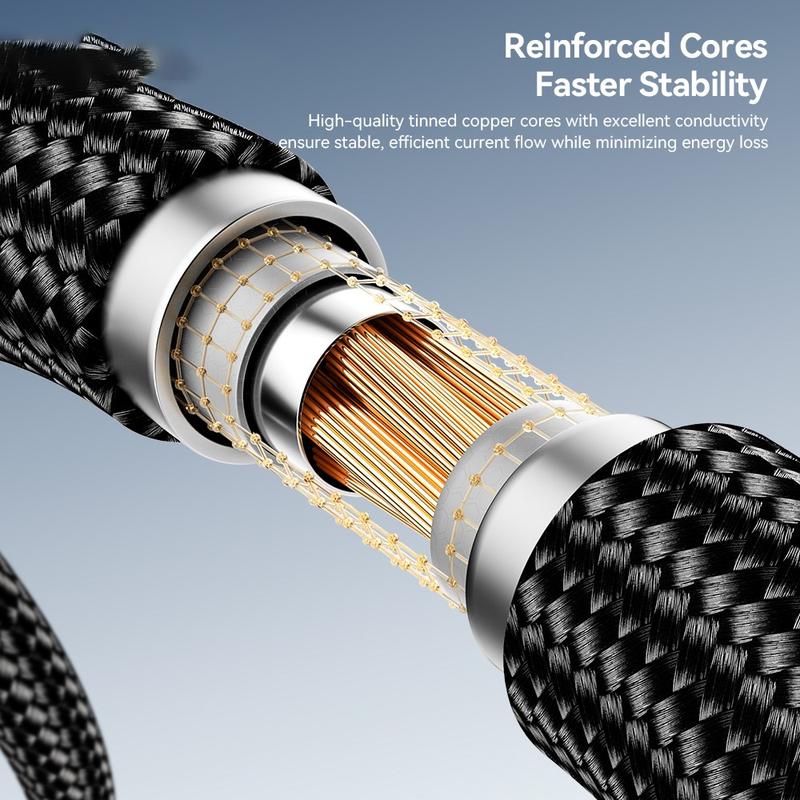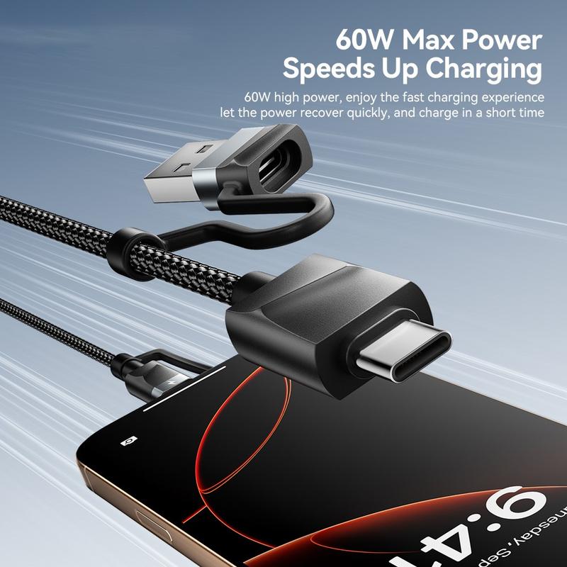 Den stöder laddning med upp till 60 W Power Delivery och kan snabbt ladda kompatibla USB-C-enheter samtidigt som den erbjuder pålitlig laddning för andra enheter som stöds. Kabelns hållbara kontakter i aluminiumlegering och förstärkta flätade konstruktion förbättrar flexibiliteten och motståndskraften mot daglig slitage, vilket gör den idealisk för resor, kontoret och daglig användning. En inbyggd kardborrebandshållare håller kabeln snyggt organiserad när den inte används.