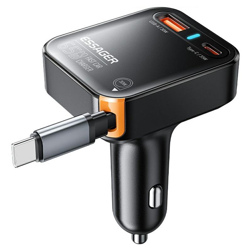 Essager 65W snabbladdare för bil med utdragbar USB-C-kabel - USB-A- och Typ-C-portar, smart strömfördelning