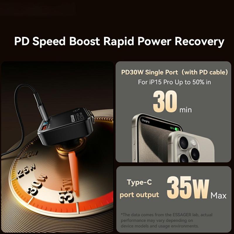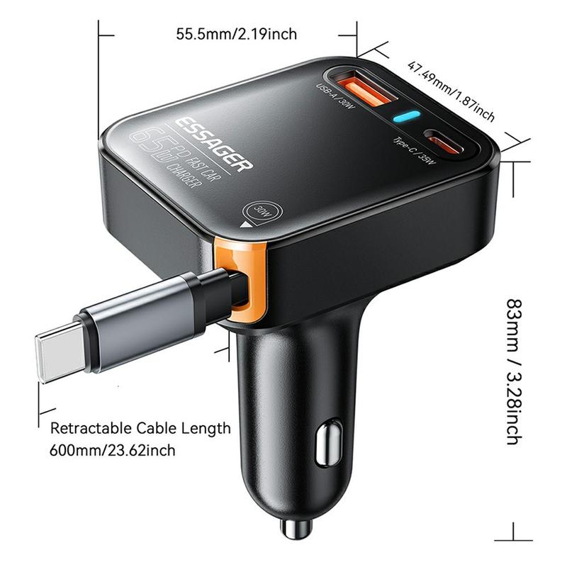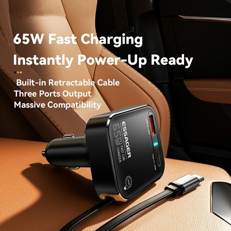 ESSAGER 65W snabbladdare kombinerar funktionalitet med genomtänkt design. Den infällbara kabeln håller din bil städad, medan det intelligenta strömhanteringssystemet säkerställer att dina enheter laddas snabbt och säkert varje gång. Kompakt, tålig och snygg - ett måste för alla som är på resande fot.
