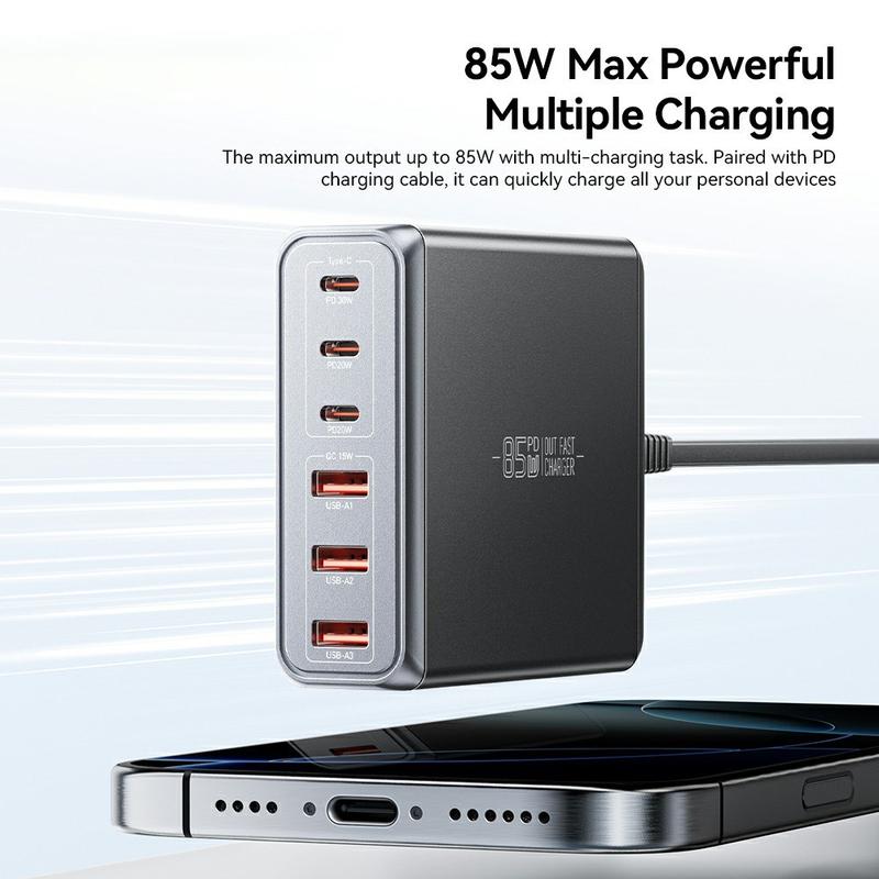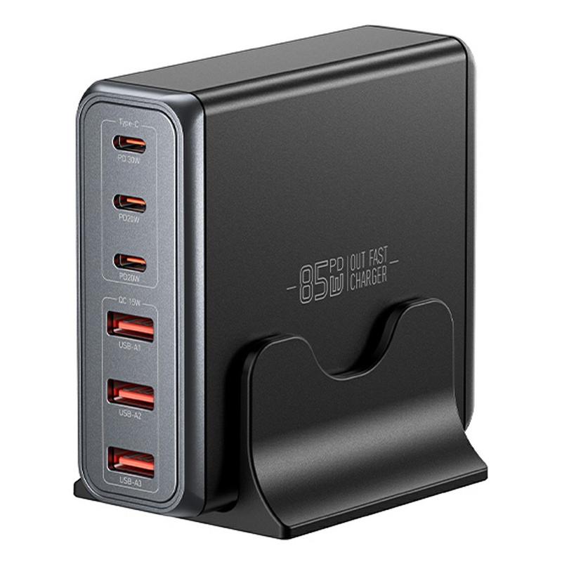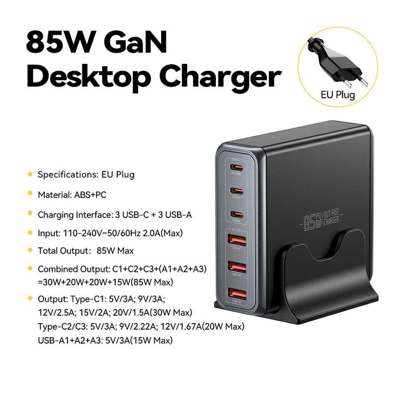 Essager 85W GaN-laddningsstation - 3× Type-C + 3× USB-A snabbladdningsadapter för flera enheter (EU-kontakt)