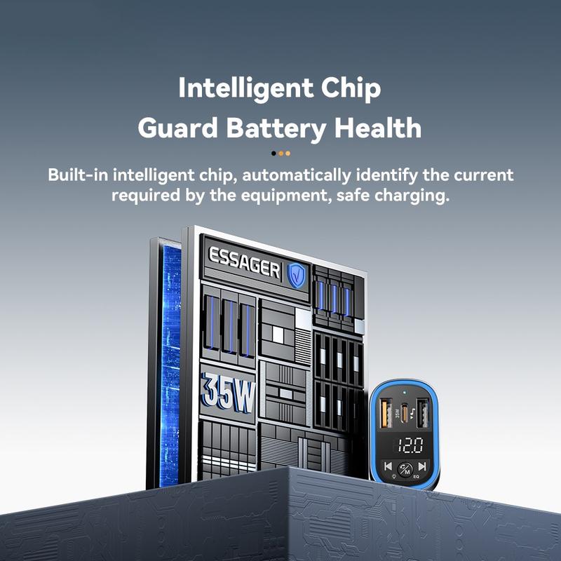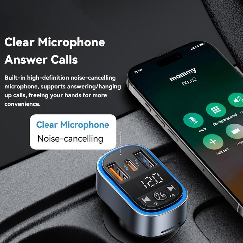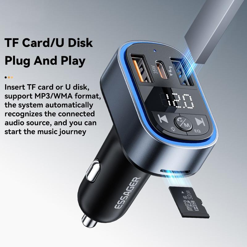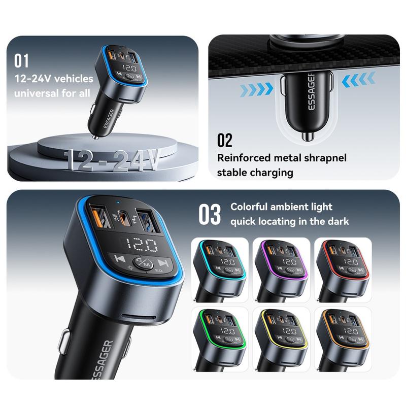 ESSAGER ECCFM-CT0G-P kombinerar snabbladdning, Bluetooth 5.3 trådlös streaming, en FM-sändare, HD-handsfree-samtal och stöd för mediauppspelning - allt i ett kompakt och elegant biltillbehör. En perfekt uppgradering för säkrare körning och förbättrad underhållning i bilen.