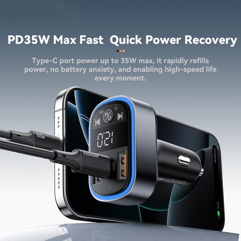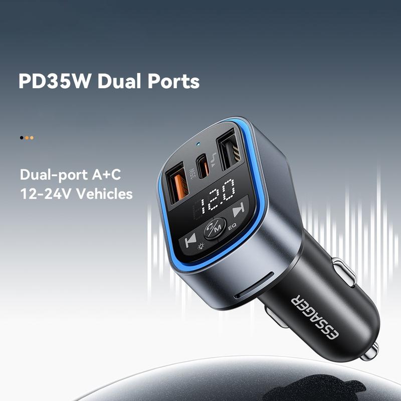 Essager ECCFM-CT0G-P 35W PD snabbladdande billaddare med dubbla portar USB-C/USB-A, Bluetooth 5.3 FM-sändare, HD-samtalsmikrofon