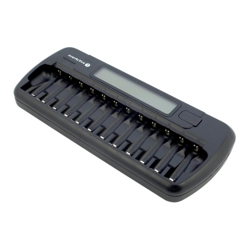 everActive NC 1200 har upp till 12 oberoende laddningskanaler för NI-MH-batterier i storlekarna R6/AA eller R03/AAA, varje cell laddas individuellt. Det gör att du kan ladda 12 laddningsbara R6/AA- eller R03/AAA-batterier i valfri konfiguration/kombination, med valfri kapacitet och från valfri tillverkare.