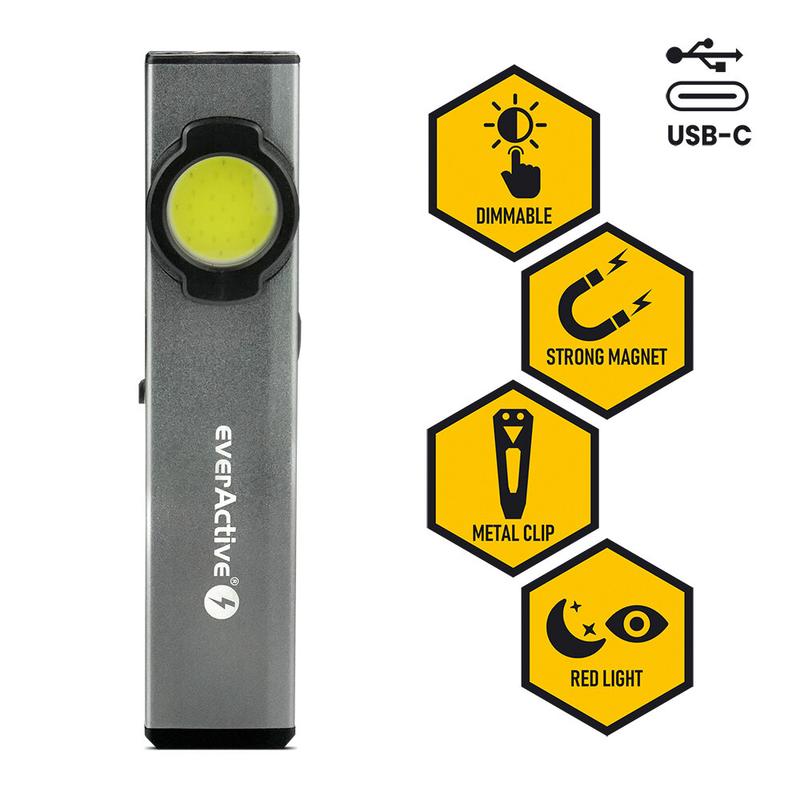 EverActive WL-250R uppladdningsbar LED-verkstadsficklampa - 300 lumen, 4 lägen, magnetisk bas och klämma