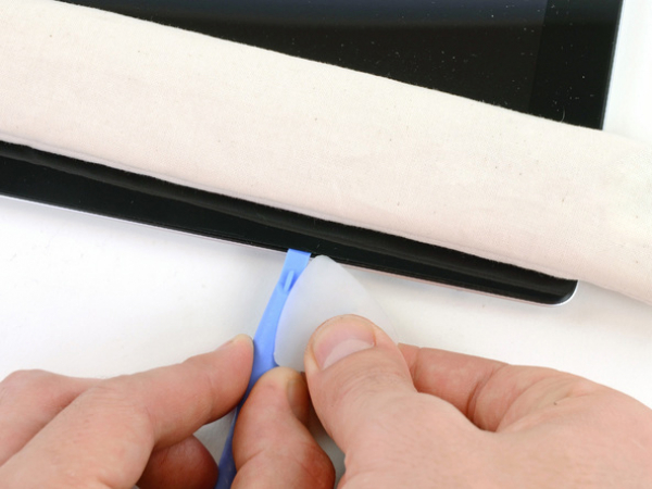 Använd plektrumet som fortfarande är vid den nedre kanten av iPad och lossa limmet längs det nedre vänstra hörnet.