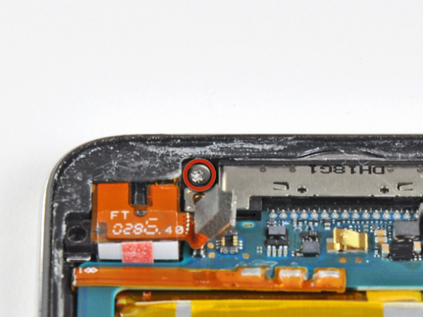 Det är en väldigt tunn bandkabel som ansluter volym- och ström-knapparna till logikkortet. Försök att komma runt detta område som visas så att inte kabeln skadas. Den är oerhört bräcklig.