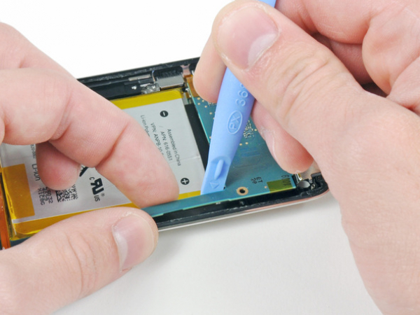 Efter att batteriets sidor lossats, börja bänd upp änden på logikkortet. Börja uppifrån och arbeta dig ner på sidan av logikkortet.