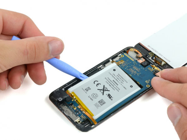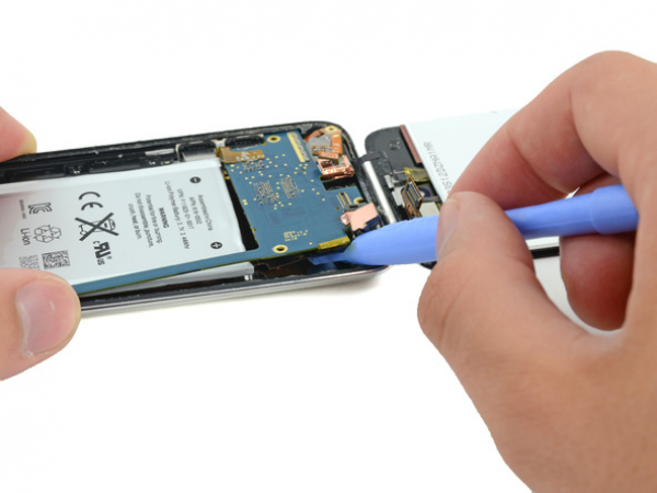 Använd vårt öppningsverktyg för att försiktigt lyfta upp änden av hörlursuttaget närmast batteriet ur dess fördjupning.