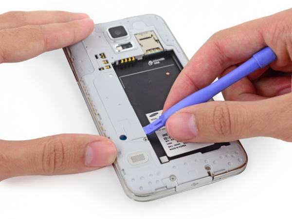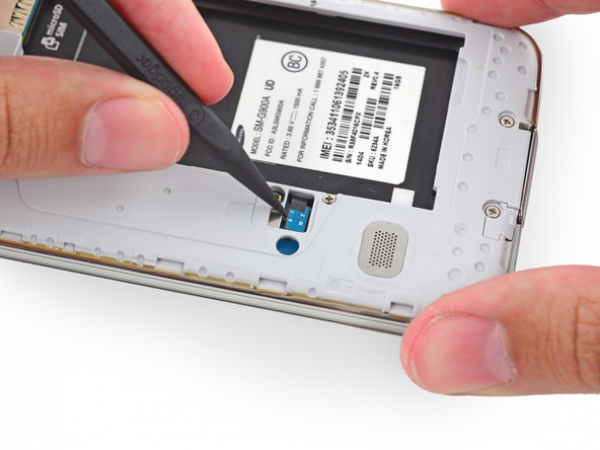 Det finns en fördjupning i det nedre högra hörnet på telefonens batteri. Återigen, för in ett öppningsverktyg eller om möjligt fingret/nageln i fördjupningen, och lyft upp batteriet.