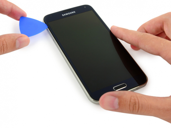 I följande steg måste du använda en öppningsmanick (ett plektrum) för att avlägsna limmet som håller frontpanelsglaset. Följ instruktionerna och böj endast när det är skrivet. Om du stöter på motstånd, tillämpa iOpenern igen och försök igen.