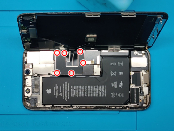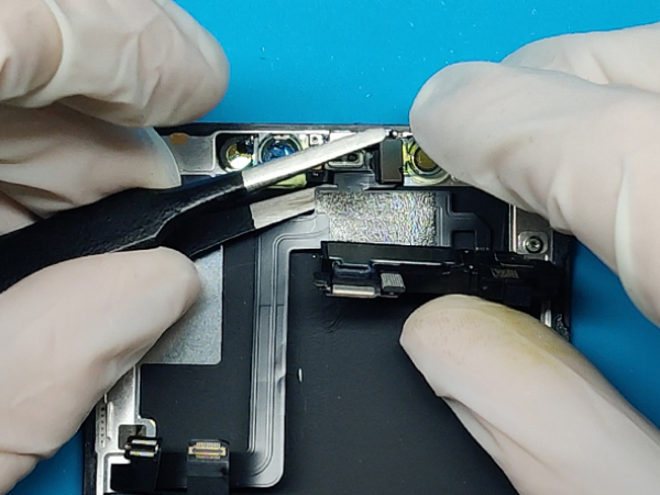 - Installera sensorn och hörluren till den nya displaypanelen. - Säkra den med 3 Y000 skruvar. - Anslut kabelkontakten av OLED panel med logikkortet. - Anslut framsensorns hopsättning med logikkortet. - Installera metallfästet och säkra den med sex 1.3mm Y000 skruvar. - Återanslut batterianslutningen och installera metallfästet. - Säkra den med två 1.3mm Y000 skruvar.
