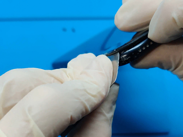 Använd en pincett för att försiktigt ta loss sensorn och hörlursmaskan från hålrumet.