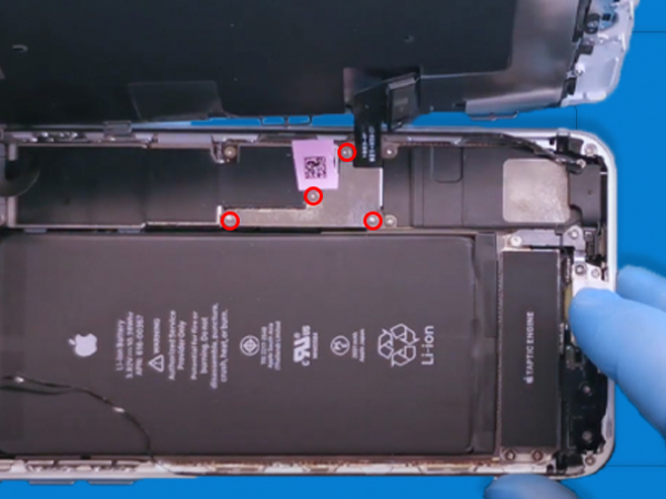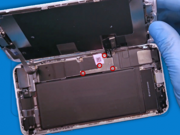 - Ta loss de fyra Phillips skruvar som säkrar den nedre LCD kabelfästet: - Ta loss skruvarna som säkrar dispayens kontaktfäste och ta loss det. - Använd försiktigt en spudger för att koppla loss batterikontakten, bänd upp digitaliserarens kabelkontakt från dess uttag. - Lyft upp kabeln till den separeras. Tips: - Håll koll på varje skruv så att du kan sätta tillbaka dem där de hör till för att undvika skador på din iPhone.