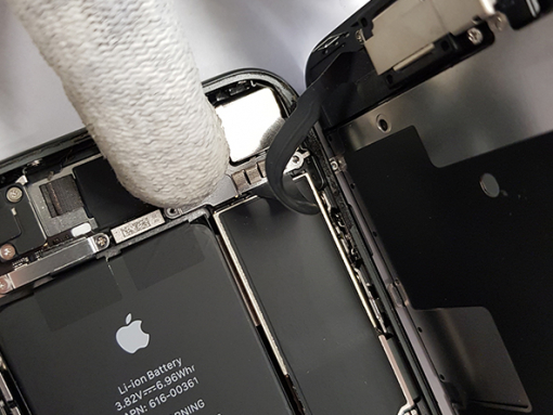 - Ta bort SIM-kortplatsen. - Ta loss de två pentalob skruvarna. - Skjut ett platt verktyg mellan displayen och ramen. - Rör dig sakta längs kanterna. - Öppna iPhone genom att svinga upp skärmen från vänster sida. - Ta inte displayen helt bort från bakglaset, eftersom flera kablar som kopplar till logikkortet sitter där och kan riskera att skadas. - Öppning av mobilskärmen utsätter dess vattentäta förmågor. - Se till att du förberett de ersättande förseglingarna innan du börjar med reparationen. Tips - Om skärmglaset spruckit, kan du undvika ytterligare skador genom att tejpa över skärmen. - Använd en värmepistol (hårtork) runt kanterna på iPhone i ca en minut för att mjuka upp limmet.