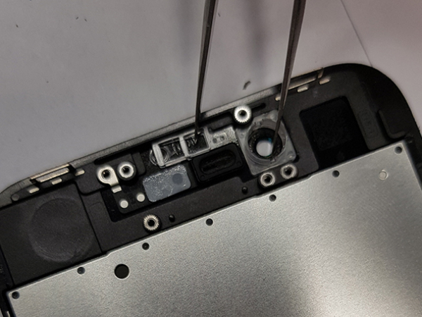 - Koppla bort skruvarna som fäster högtalaren och sensorn. - Lyft försiktigt upp metallskyddet och ta loss det. - Ta bort örhögtalaren. - Skruva bort de fyra skruvar som fäster hemknappen. - Ta bort metallskyddet. - Ta bort de tre skruvar till vänster och de tre skruvar till höger om skyddet. - Lossa de tre toppsensorerna, hemknappen och metallskyddet. - Lossa plasthållare för kamera och sensorer och fäst vid ny reservdel. Tips: -Värm upp skärmen för att lossa limmet.
