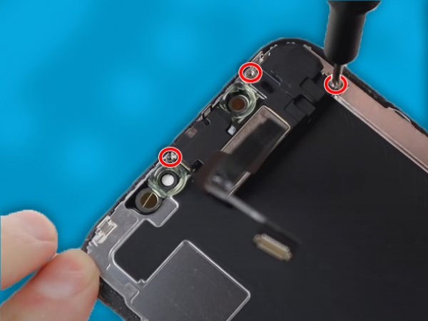 - Ta loss de fem Y000 tri-point skruvarna som säkrar logikkortet vid kontaktfästet. - Ta försiktigt loss kontaktfästet. - Koppla från frampanelens sensor kontakt. - Bänd upp OLED panelens kabelkontakt med nageln eller med spudgern. - Använd spetsen av en spudget för att bända upp digitaliserarkabeln. - Sensorns kabel på frampanelen sitter lätt på plats. - Lyft försiktigt kabeln tills att limmet separeras. - Mobilens hopsättning för displayen för nu vara borttagen.