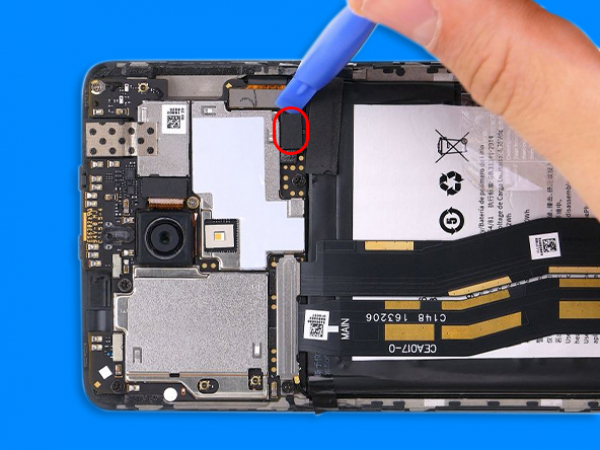 - Vid botten av mobilen, under batteriet, koppla loss den sammankopplade flexkabeln från dotterkortet.