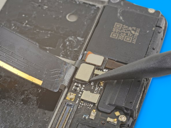- Kläm samman en pincett och sätt in spetsen under den rektangulära kontakdynan för att bända upp och lossa den.