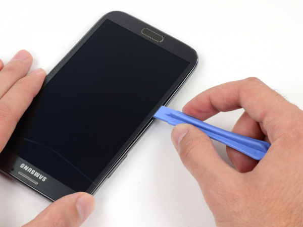 Sätt in ett öppningsverktyg mellan mellanramen och frontpanelen (sidan på telefonen).